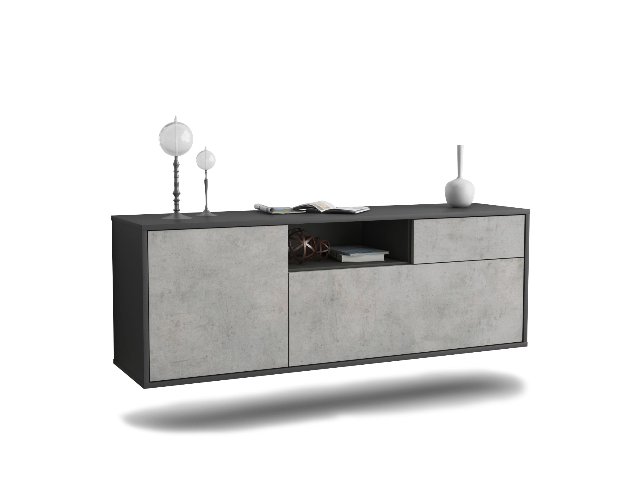 100% Hergestellt in Deutschland und mit Ökostrom produziert. Der Holzschrank überzeugt durch hochwertige Materialien sowie eine erstklassige und saubere Verarbeitung. Der Aufbau des Lowboards gestaltet sich aufgrund der Aufbauanleitung mit grafischen Darstellungen und Illustrationen einfach und schnell. Der Versand erfolgt innerhalb von 2-3 Werktagen. Dieses Lowboard hat Gesamt-Maße von 136x49x35cm. Viel Platz, eine leere Wand, kein passendes Möbelstück? Mit der Gesamtlänge von ca. 1,36 Meter bietet dieser Schrank vielzählige Einsatzmöglichkeiten. Die Frontfarbe Beton wirkt zeitlos und hoch modern. Die steinähnliche Nachbildung zeigt sich als klassisch, stilvolles Grau meliert. Die Betonoptik im Industrie-Look liegt gerade voll im Trend. Der anthrazit-matte Korpus harmoniert mit allen Farben und wirkt besonders edel im Kontrast zu hellen Wänden.