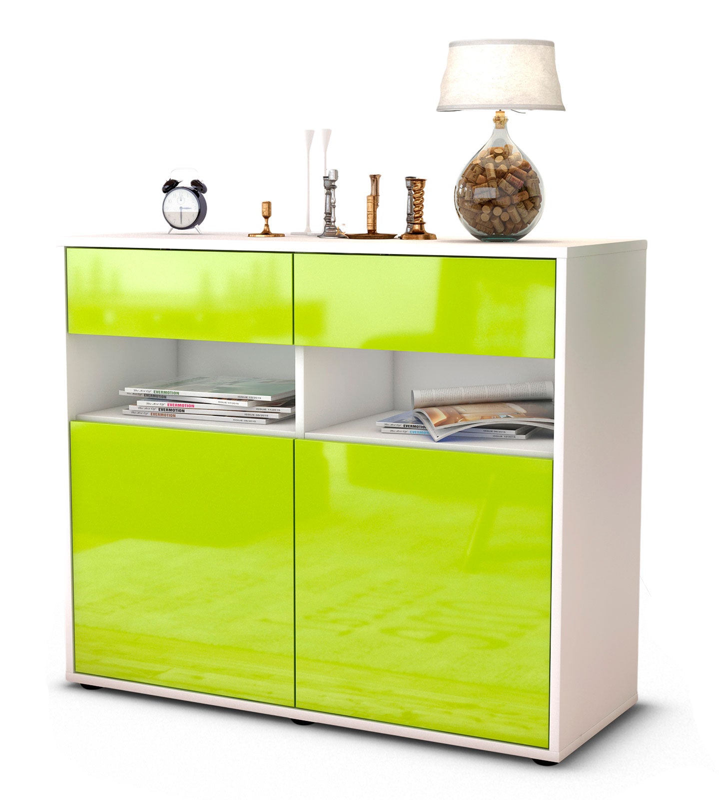Dieses Sideboard hat Gesamt-Maße von 92x79x35cm. Viel Platz, eine leere Wand, kein passendes Möbelstück? Unsere 92 cm lange Kommode ist die perfekte Lösung! Die Frontfarbe Hochglanz Limettengrün bringt Schwung, Glanz und Farbe in jede Wohnung. Das knallig, leuchtende grün ist glänzend und wirkt wie ein frisches Apfelgrün oder eine saftige Limette. Der weiße matte Korpus kann überall integriert werden. Mit der beruhigenden Farbe weiß, findet sich leicht Stellplatz für dieses schöne Möbelstück.
