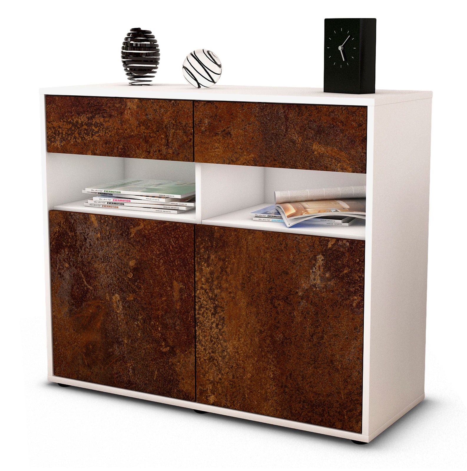 Dieses Sideboard hat Gesamt-Maße von 92x79x35cm. Viel Platz, eine leere Wand, kein passendes Möbelstück? Unsere 92 cm lange Kommode ist die perfekte Lösung! Die Frontfarbe Rost wirkt antik und verleiht einen Retro Industrie-Look. Die Darstellung von alten, verwitterten oder verrosteten Metall / Eisen wirkt Rot-Braun bzw. Bronze-Farben. Der weiße matte Korpus kann überall integriert werden. Mit der beruhigenden Farbe weiß, findet sich leicht Stellplatz für dieses schöne Möbelstück.