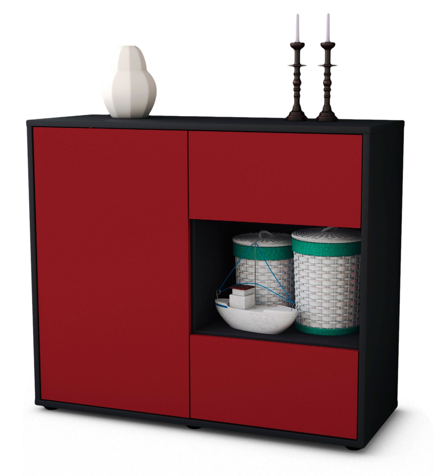 Dieses Sideboard hat Gesamt-Maße von 92x79x35cm. Viel Platz, eine leere Wand, kein passendes Möbelstück? Unsere 92 cm lange Kommode ist die perfekte Lösung! Die Frontfarbe dunkles Bordeaux Rot bringt Wärme ins Haus. Das intensive Weinrot ist einer der edelsten Rot Töne und verleiht jeder Einrichtung einen Glamour Faktor.Der anthrazit-matte Korpus harmoniert mit allen Farben und wirkt besonders edel im Kontrast zu hellen Wänden.