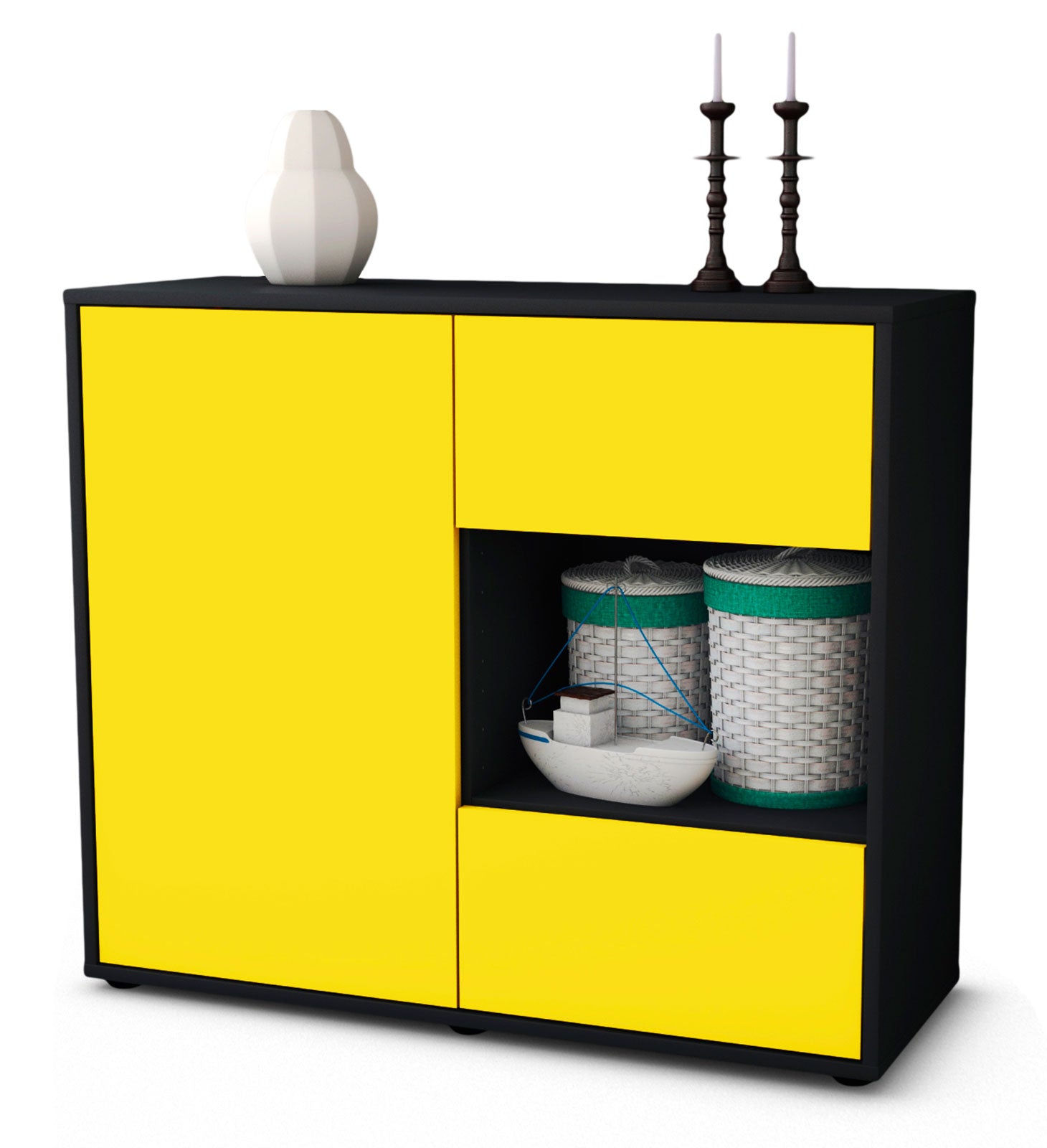 Dieses Sideboard hat Gesamt-Maße von 92x79x35cm. Viel Platz, eine leere Wand, kein passendes Möbelstück? Unsere 92 cm lange Kommode ist die perfekte Lösung! Die Frontfarbe Sonnengelb verleiht Räumen Freude und positive Energie ohne diesen farblich zu überfluten. Der eher gelb pastell Ton verschafft eine frische Atmosphäre.Der anthrazit-matte Korpus harmoniert mit allen Farben und wirkt besonders edel im Kontrast zu hellen Wänden.