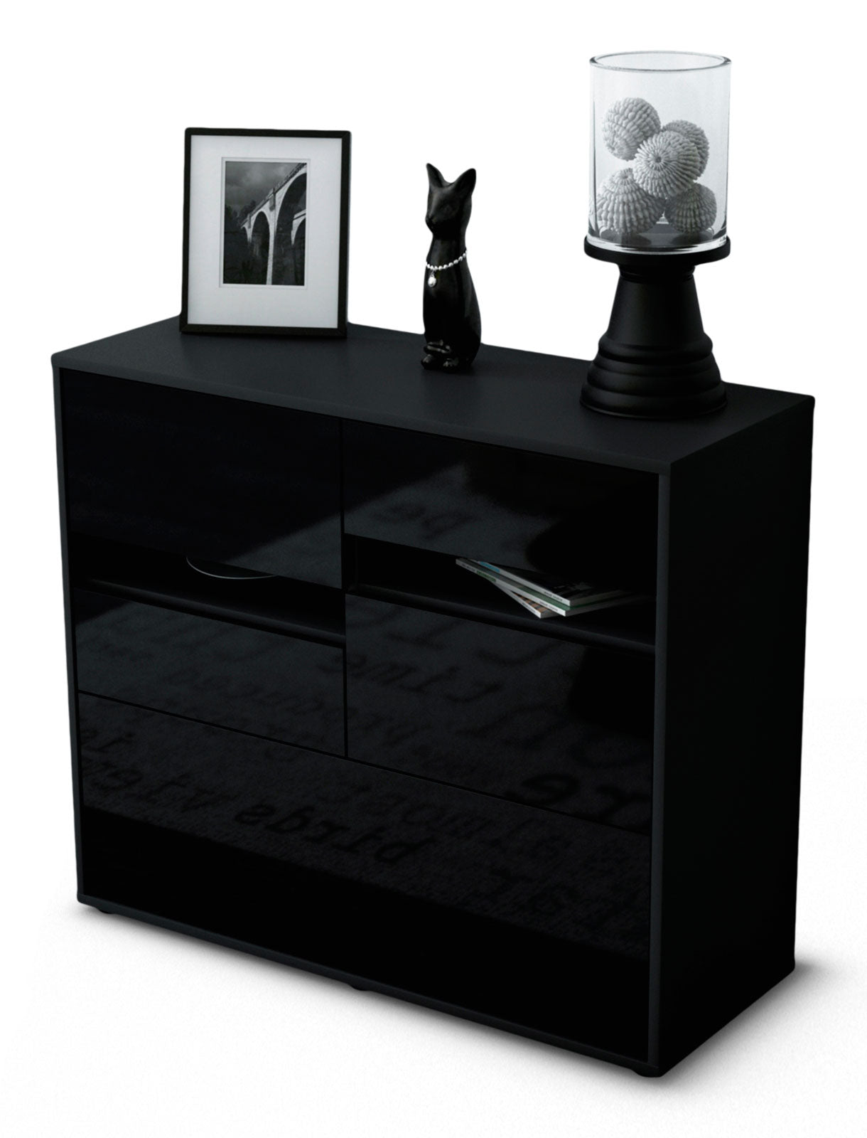 Dieses Sideboard hat Gesamt-Maße von 92x79x35cm. Viel Platz, eine leere Wand, kein passendes Möbelstück? Unsere 92 cm lange Kommode ist die perfekte Lösung! Die Frontfarbe Hochglanz Schwarz ist eine der beliebtesten Möbelfarben. Glanz Dekore sind hoch modern und liegen immer im Trend. Die Front ist glänzend und und leicht spiegelnd. Der anthrazit-matte Korpus harmoniert mit allen Farben und wirkt besonders edel im Kontrast zu hellen Wänden.