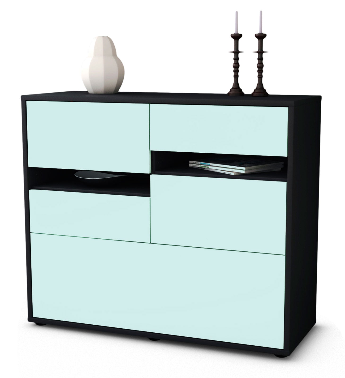 Dieses Sideboard hat Gesamt-Maße von 92x79x35cm. Viel Platz, eine leere Wand, kein passendes Möbelstück? Unsere 92 cm lange Kommode ist die perfekte Lösung! Die Frontfarbe Eisblau verleiht Ihrem Raum Frische. Das Himmelblau fördert eine sanfte Atmosphäre. Die Farben Hellblau und Mint werden gerne für moderne Wohnräume verwendet. Der anthrazit-matte Korpus harmoniert mit allen Farben und wirkt besonders edel im Kontrast zu hellen Wänden.