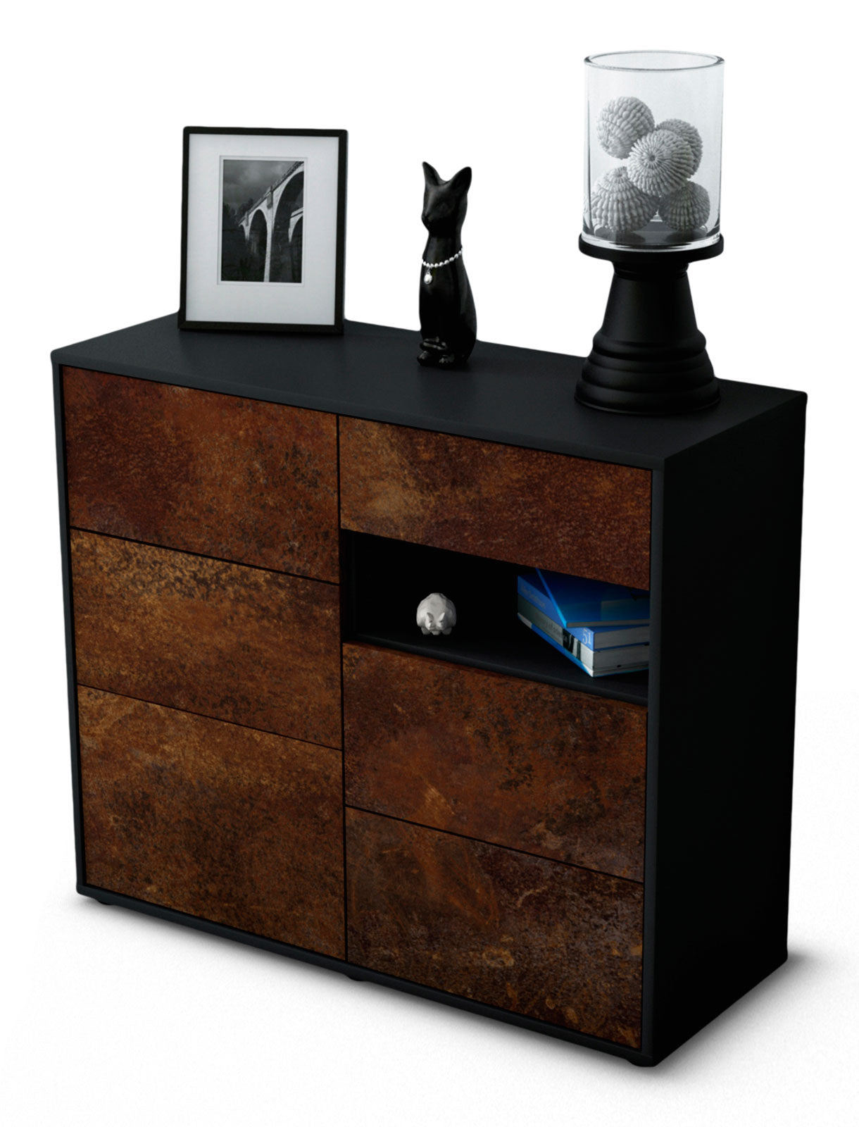 Dieses Sideboard hat Gesamt-Maße von 92x79x35cm. Viel Platz, eine leere Wand, kein passendes Möbelstück? Unsere 92 cm lange Kommode ist die perfekte Lösung! Die Frontfarbe Rost wirkt antik und verleiht einen Retro Industrie-Look. Die Darstellung von alten, verwitterten oder verrosteten Metall / Eisen wirkt Rot-Braun bzw. Bronze-Farben. Der anthrazit-matte Korpus harmoniert mit allen Farben und wirkt besonders edel im Kontrast zu hellen Wänden.