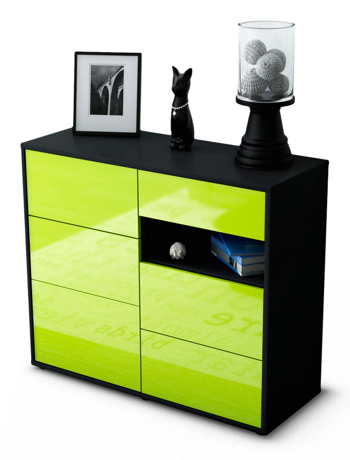 Dieses Sideboard hat Gesamt-Maße von 92x79x35cm. Viel Platz, eine leere Wand, kein passendes Möbelstück? Unsere 92 cm lange Kommode ist die perfekte Lösung! Die Frontfarbe Hochglanz Limettengrün bringt Schwung, Glanz und Farbe in jede Wohnung. Das knallig, leuchtende grün ist glänzend und wirkt wie ein frisches Apfelgrün oder eine saftige Limette. Der anthrazit-matte Korpus harmoniert mit allen Farben und wirkt besonders edel im Kontrast zu hellen Wänden.