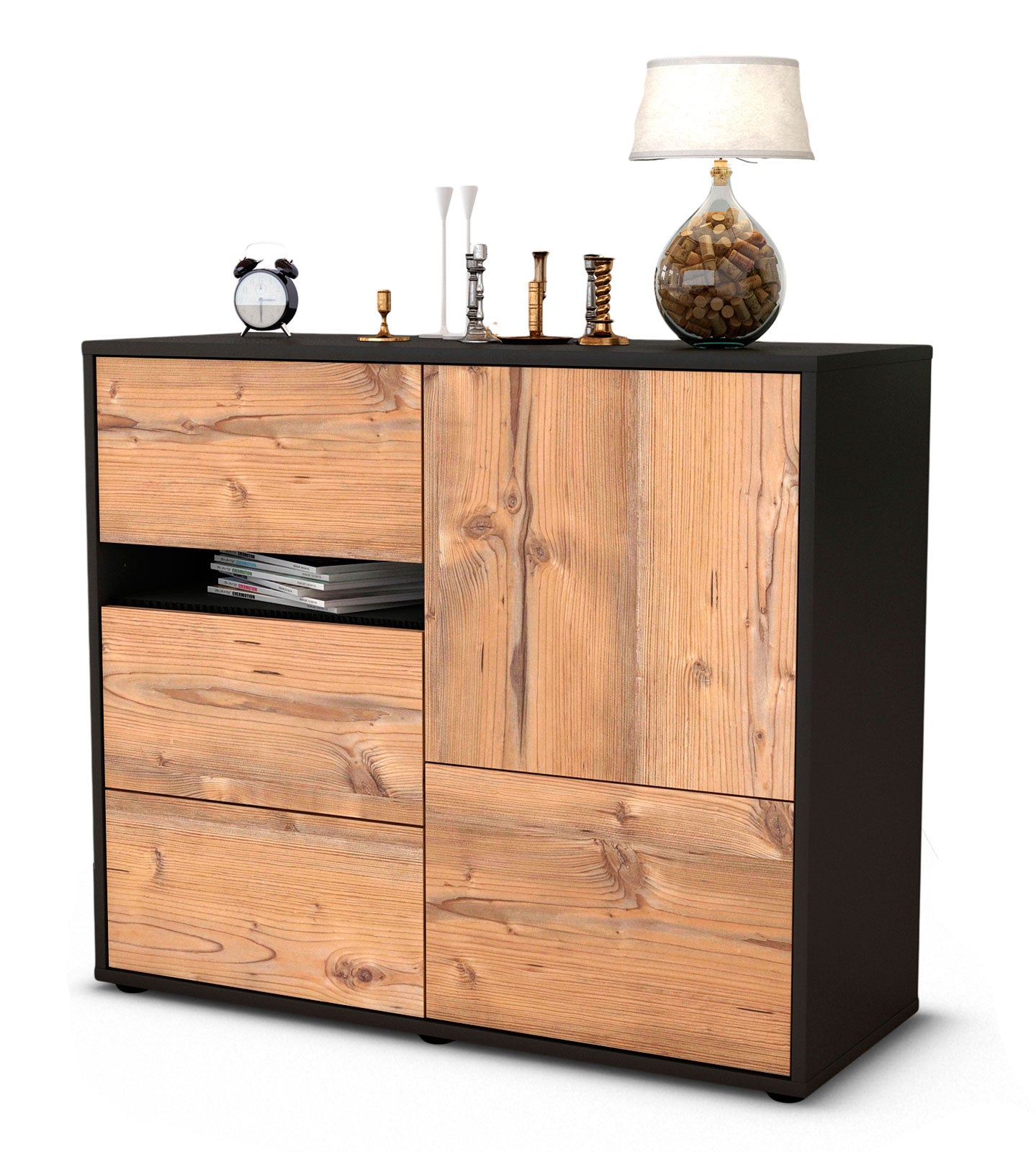 Dieses Sideboard hat Gesamt-Maße von 92x79x35cm. Viel Platz, eine leere Wand, kein passendes Möbelstück? Unsere 92 cm lange Kommode ist die perfekte Lösung! Die Holz Front Pinie Nachbildung ist ein freundliches Braun mit farblich abgesetzter Holzmaserung. Die Integrierung in Wohnräume ist durch das warme Holz leicht möglich. Der anthrazit-matte Korpus harmoniert mit allen Farben und wirkt besonders edel im Kontrast zu hellen Wänden.