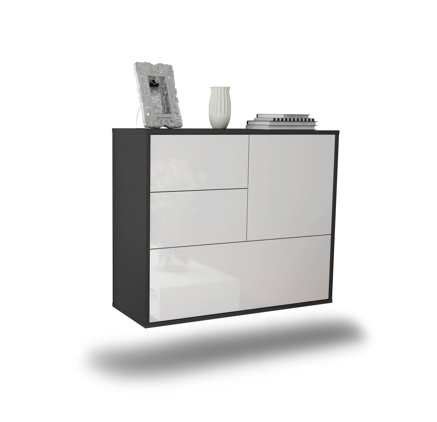 Dieses Sideboard hat Gesamt-Maße von 92x79x35cm. Viel Platz, eine leere Wand, kein passendes Möbelstück? Unsere 92 cm lange Kommode ist die perfekte Lösung! Die Frontfarbe Hochglanz Weiß bringt als reine und unschuldige Farbe Ruhe in jeden Raum. Mit dem Glanz Weiss erzeugt man einen hochwertigen glänzenden Kontrast zu dunklen Wänden. Der anthrazit-matte Korpus harmoniert mit allen Farben und wirkt besonders edel im Kontrast zu hellen Wänden.